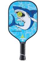 Introduce your kids to the game with this Joola Megalodon Pickleball Paddle. Designed for players 14 and under, this paddle averages in at 7.9 ounces and features a 4” grip. It consists of a polypropylene core and a Carbon Fiber surface providing an optimal blend of power and control, ideal for the learning player. Smaller in size than adult paddles, this youth paddle provides younger players with a more manageable entryway into the sport.